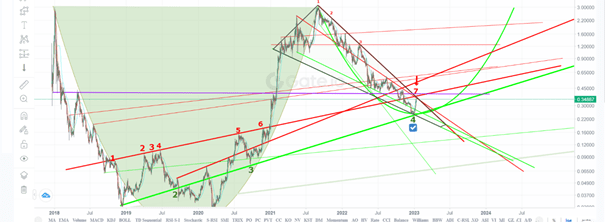 Mum grafiklerinde yaptığım inceleme sonucunda büyük bir fincan-kulp ve alçalan kama formasyonlarını görmekteyim. Fincanın derinliği 3,03 usdt değerindedir. Fincan formasyonu yukarıdaki analizde de gösterdiğim şekilde bir dip sonrası tekrar yükseliş olup direnç noktasına gelir böylelikle fincan oluşur ve sonra fincanın kulpu oluşur. Kulp oluşumu da bitmiş olan bu analizde artık yükseliş fincanın derinliği kadar yani 3,03 usdt kadar yeni bir yükseliş olur.